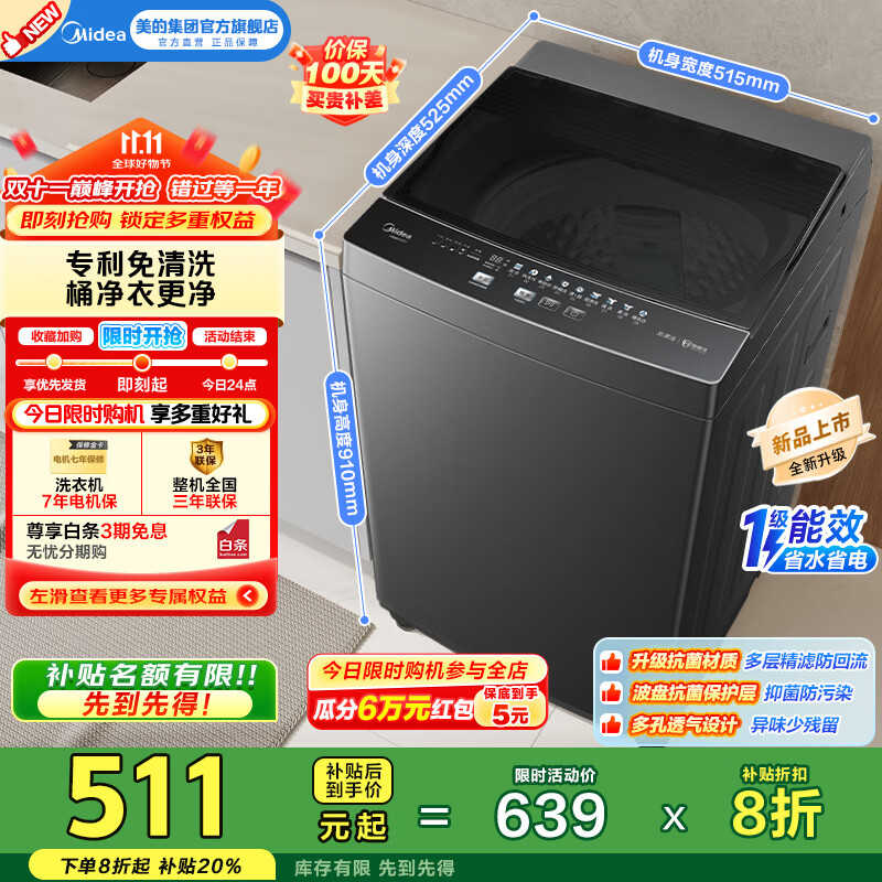 包邮 美的(Midea)全自动波轮洗衣机 8kg公斤家用电器品质电机智能预约立方内桶水电双宽一级能效 MB80V37T